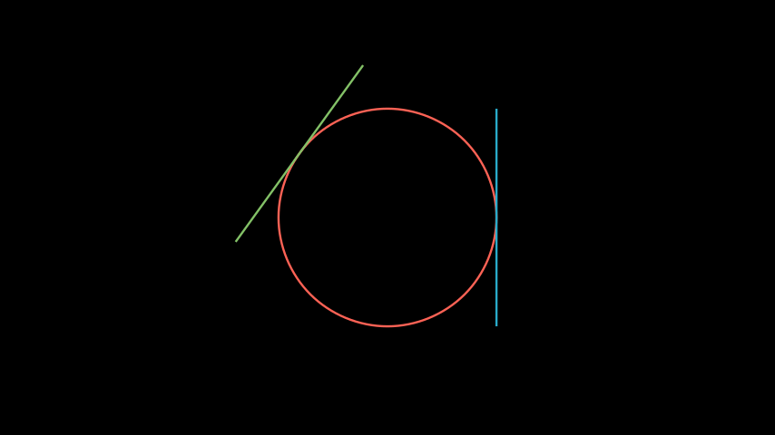 from manim import * class TangentLineExample(Scene): def construct(self): circle = Circle(radius=2) line_1 = TangentLine(circle, alpha=0.0, length=4, color=BLUE_D) # right line_2 = TangentLine(circle, alpha=0.4, length=4, color=GREEN) # top left self.add(circle, line_1, line_2)